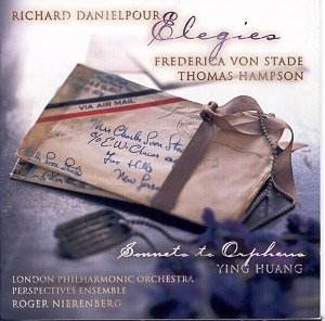 The genesis of Elegies completed in 1997 is worth telling for the circumstances of the commission are somewhat unusual. Frederica von Stade's father was killed in Europe during World War II, a few months before Frederica's birth. Many years later, she found a bundle of her father's letters, lost them and found them again. She then formed an idea of a work based on these letters. A conversation with Roger Nierenberg, musical director of the Jacksonville Orchestra, let to a joint commission to the writer Kim Vaeth and to the composer Richard Danielpour. So, Vaeth devised poems based on von Stade's letters. Danielpour set them for mezzo-soprano (the girl), baritone (the father) and orchestra. This substantial "song cycle" falls into five sizeable sections. Vigil opens with tolling bells creating an ominous mood. The girl sings her longing to touch the spirit of her father. The coda is introduced by a restatement of the tolling bells motif and ends softly. In the second section Lacrimosa the music evokes the horrors of death with some martial, brutal, reckless music which pauses for the father's plea "Where is my beloved". The girl's tender reply is unheard by the father who repeats his questioning. The "war music" is recalled in the coda. The next section Benediction is a tender song in which the father imagines the course of his unborn child's life. In the fourth section Litany the girl invokes her father's spirit again. Her meditation is interrupted by a nervous interlude recalling the earlier "war music". This fades away and father and daughter are at long last united in "soft, closely matched musical lines". This section ends with a peaceful coda. The last section In Paradisum sings the hard-won serenity of the girl. Elegies is a beautiful and moving work that is likely to earn Danielpour many new admirers for he has a sure sense of orchestral colours and his vocal writing is eminently singable, unashamedly melodic, generally syllabic with few word repetitions, almost straightforward though supple and subtle throughout. Frederica von Stade and Thomas Hampson sing beautifully and are superbly supported by the LPO and Roger Nierenberg.