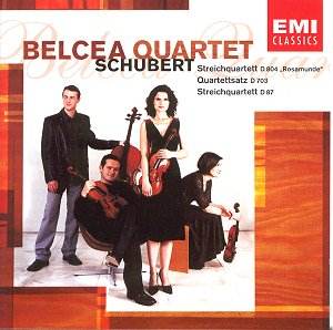 An overview of Schubert as a writer of string quartets is provided by the Belcea’s commendably imaginative combination for this debut CD for EMI. The composer was a youth of sixteen when he wrote the final quartet they play, and (given his short life of 31 years) comparatively old at 23 and 27 for the other two. Both the A minor quartet and the quartet-movement (which is probably the most familiar work here) are fairly subdued affairs, indeed it is only when we get to the final pair of tracks on the disc that the mood perks up with sprightly, bright speeds and relatively cheerful musical material. That being said, the music is profound, almost symphonic in both structure and texture, with no more than a passing nod at his great predecessors or contemporaries, Haydn, Mozart and Beethoven (Schubert was even younger at thirteen when he tackled his first string quartet). For all the right reasons no doubt, the Belcea Quartet sometimes plays with an excessively exaggerated feel for phrasing, with too much shaping away from the natural stress on the first note followed by the so-called feminine ending. Yet their sense of tension and drama, often achieved through disciplined control of quiet dynamics (Track 3: 1’44"), produces extraordinary results. So too are the magical moments in these glorious works, for example the effortlessly smooth and melting transition from minor to major in the opening movement of the A minor quartet (Track 1: 10’ 12"). | Error processing SSI file |