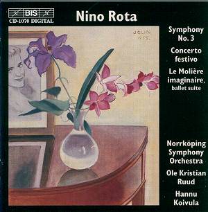 The Symphony dates from 1956-57 and one detects a strong influence of Prokofiev (and, in its opening light-hearted movement, a similarity to John Ireland's A London Overture in his evocation of urban bustle). The second movement begins with misty oscillations before military brass signals not so much a funeral march as an elegy. The last movement has the buffoonery and grotesque musical figures that Rota has used in Fellini's films; it's almost as if you are listening to music for a commedia dell'arte production.