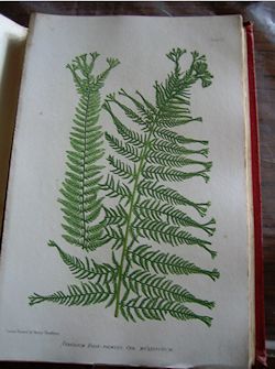 I was interested to see the Moore/Bradbury volume because of the nature printing. It was the first book to be printed in Britain using this technique where the illustrations are printed direct from the plant so are more accurate than paintings. It was written by Thomas Moore who was the curator of the Chelsea botanic garden and co-editor of Gardener's Chronicle. The volume was edited by the eminent botanist and horticulturist John Lindley. Henry Bradbury was responsible for the nature printed plates. There are various methods that can be used. One is to roll ink onto the fern frond and then impress it onto the paper. This can only produce a very limited number of copies. For book printing the frond was placed between a sheet of steel and something softer such as lead. Under pressure the fern will imprint in the lead. The lead can then be electroplated and the printing done from that. This can be used a number of times. The imprint can be coloured before printing or the printed pages can be hand-coloured. The benefit of this process is that it reproduces even the minutest details. It is only suitable for flat objects so ferns and seaweeds are particularly suitable.