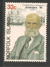 Isaac Robinson, depicted on the Norfolk Island stamp shown, was born in June 1825 in Tasmania, son of Yorkshire man John Robinson. He became an agent for the Australian shipping line Burns, Philp and Co which took him to Norfolk Island. On 12th June 1865 he married Hannah Quintal, fourth daughter of John and Dinah Quintal. Isaac had obviously had an affair with Kezia, an elder sister of Hannah for Kezia gave birth to their daughter, Sarah on 20th December of that year. Isaac and Hannah had eleven children, the youngest being christened Harriet Fairfax in honour of Harriet, Henry Fairfax’s wife. Isaac became involved in the affairs of the island and was the registrar and as he writes in his letters ‘general factotum.’ He also became the first and only US Consul to Norfolk Island. Whaling was a major occupation on the Island and American whalers were frequent visitors during the season. The Americans introduced some of their culture, especially foodstuffs and were generally popular. In 1897 Robinson introduced the American celebration of Thanksgiving, incorporating it into the Anglican Harvest Festival. Thanksgiving is celebrated on the island to this day one of very few countries outside the USA to do so.