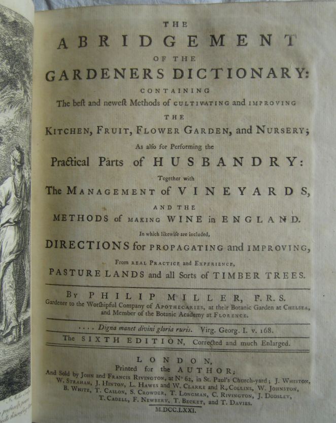 Philip Miller [1691-1771] The abridgement of The Gardeners Dictionary : containing the best and newest methods of cultivating and improving the kitchen, fruit, flower garden, and nursery; together with the management of vineyards, and the methods of making wine in England. In which likewise are included directions for propagating and improving, from real practice and experience, pasture lands and all sorts of timber trees - The sixth edition, corrected and much enlarged. (1771)see also TV Programme Timothy Walker: A Blooming History