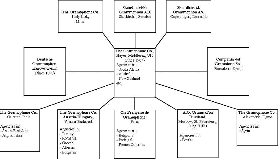 By the summer of 1912 The Gramophone Company had factories operating in Austria (Aussig), England (Hayes), France (Ivry), Germany (Hanover), India (Sealdah), Poland (Warsaw), Russia (Riga), and Spain (Barcelona). Distributors were located in Australia, Ceylon, East Prussia, Holland, Italy, New Zealand, Persian Gulf, South Africa, and Tasmania (from the EMI website).
