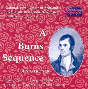 This recent National Youth Choir of Scotland release is entitled "A Burns Sequence" after John Gardner's 1995 piece for choir and orchestra. The work takes the form of a song cycle consisting of eight settings of Burns' poetry ranging from the lyrical "My love is like a red, red rose" to the coquettish "O whistle an' I'll come to you. It was written as a result of a commission by the British Federation of Youth Choirs.