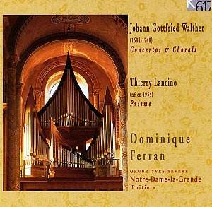 Johann Gottfried WALTHER (1684-1748) Concerto by Meck (Antonio Vivaldi RV 275) Concerto by Torelli Concerto by Gregori Concerto by Taglietti Partita on the Choral Meinen Jesum lass ist nicht Partita on the Choral Jesu meine Freude Choral Hilf, Gott, das mirs gelinge Thierry LANCINO (b 1954) Prisme Recorded on the Yves Severe organ, Notre-Dame-la-Grande, Poitiers, March 1998 |