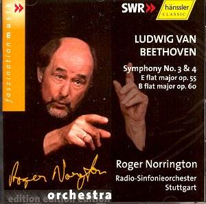 Listen to the first two minutes of the first movement of the Eroica (track one) where Norrington sets the scene for a truly remarkable performance. Indeed, the scope and scale of the opening movement of the Eroica is stupendous, the first expansive masterpiece of musical architecture. Norrington is never dull. His tempo is excellent. The music is very exciting and the attention to detail a sheer delight. The first climax (bar 37ff.) is very powerful and this is followed by the most exquisite woodwind phrasing (bars 45ff.). Listen to the splendid staccato in the lower strings at bar 51 and ask have you ever heard it so clearly as here? The balance throughout could hardly be bettered and the sforzandos (bar 128) are there, all six of them. Norrington also captures the waltz-like lilt. He plays the exposition repeat and the woodwind excel again (bars 170ff.). Staccatos are observed and the quasi fugato section (bar 241ff) is splendid. The oboe and cello duet (bar 288ff.) sings and the trio for two clarinets and bassoon at 326 is quite lovely. What I also admire is the attack of the timpani and its accuracy. Take bars 369- 371 there are six separate timpani E flats and that is what we get. In the version by another conductor, who I will not name but who is unjustly revered, we don't get that but a drum roll! I marvelled at the secure and mercurial horn solo at 412 which blended perfectly into the oboe taking the theme up. Little things are observed. In bar 440 one timpani note is marked più forte and in this version it is! Listen to the tremendous swagger at bar 471 onwards, the sheer exuberance and controlled excitement and the build up towards the end of the movement is breathtaking!