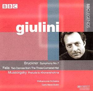 The first movement of the Seventh Symphony is for my money the finest music Bruckner ever wrote; if I had been present at the Proms the night this recording was made, I would have lurched blearily out of the hall at the end of the first movement and found a (relatively, for London) quiet place to gaze at the moon and cry until I fell asleep. However, even though this is probably the finest performance of the whole Symphony ever recorded (don’t take my word for it, listen to the audience screaming at the end of the work. My God, they sound like Americans! Fortunately for the dignity of England, the engineers faded out this unseemly and riotous jammering with abrupt dispatch and then with only a decent brief interval went on bouncily into the Falla) it’s not the best performance of the first movement. Giulini, like a sensible opera composer, pulled the punch at the end and deliberately doused the climax. That makes you listen through the rest of the symphony before you can get off at the proper end of things, and a right proper end of things it is! For a whole Bruckner Seventh Symphony, as I said, this is probably the best you’ll ever hear it. The sound, while not exceptional, is the best I’ve ever heard on any "BBC Legends" issue, as it would have to be for the Bruckner to come through so vividly. The BBC engineers understood that they faced a challenge and overcame it in good form.