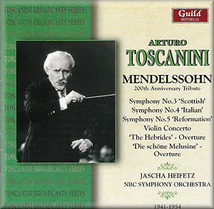 Helpful and interesting notes by Robert Matthew-Walker explain that the discs contain concert recordings of virtually every work by the composer that Toscanini conducted in the USA. Thus they supplement the commercial recordings, in particular in respect of the Violin Concerto with Heifetz as a soloist unruffled by the fast speeds and apparently using the same violin that David used at the work’s first performance. It is however possible that Mr Matthew-Walker was not given the final list of the contents of the discs as he explains both the importance of the first movement repeat in the “Italian” Symphony and that Toscanini included it only in his 1938 recorded concert which it is therefore of the greatest interest to hear. I entirely share his view on the importance of the repeat (which involves 23 bars of music not heard if it is omitted) and would have loved to have heard the earlier performance, especially given the poor recording quality on the 1954 performance that is included. Perhaps it can be included on a later disc with the String Octet and the wind arrangement of its Scherzo both of which are omitted from this set.