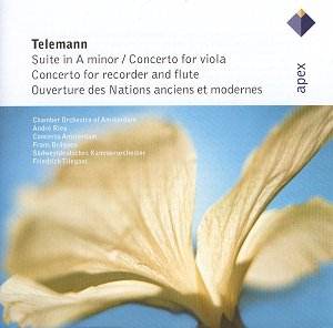 (1681-1767) Suite (Ouverture) in A minor for recorder, strings, and basso continuo TWV55:a2 *** Concerto in E minor for recorder, transverse flute, strings and basso continuo * Concerto in G for viola, strings and basso continuo ** Ouverture des Nations ancient et modernes in G, for strings and continuo TWV55:G4 * Frans Brüggen (recorder) Frans Vester (transverse flute) Gustav Leonhardt (harpsichord) Chamber Orchestra of Amsterdam * André Rieu (conductor) * Concerto Amsterdam ** Frans Brüggen (conductor) ** Südwestdeutsches Kammerorchester *** Recorded at Bennebroek, Netherlands in December 1967 and May 1968 |