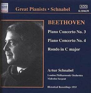 Oh, but perhaps I've left out the fundamental point. It's easy to take for granted the fact the Schnabel's Beethoven has such a very Beethovenian sound, strong, authoritative, clear but rich and direct. Nalen Anthoni's interesting notes mention William Murdoch, York Bowen, Mark Hambourg and Wilhelm Backhaus as pianists who had recorded these works previously. I should be very interested to hear all of them but I have the idea that all except the last would seem, in their attitudes to tempi and sonority, to come from another age. It was Schnabel who taught us that Beethoven sounds like this and subsequent performers have all built on the lesson. So well as to spoil our appreciation of the source of it all.