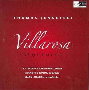 The seven pieces comprising Jennefelt's Villarosa Sequence are designed to function just as well individually as when performed as a single work. They are for unaccompanied chorus and call for the most exalted levels of virtuosity. Four are for mixed choir, one for male choir, one for female choir and one sequence for solo soprano.