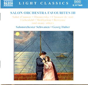 favourites: Volume 3 Julius FUČÍK (1872-1916) Florentiner Marsch (1907) Benjamin GODARD (1849-1895) Berceuse from the opera Jocelyn (1888) Oscar STRAUSS (1870-1895) Liese, ganz leise klingt’s durch den Raum from A Waltz Dream (1907) Franz von SUPPÉ (1819-1895) Teufelsmarsch (Devil’s March) Richard HEUBERGER (1850-1914) In chamber séparée, Intermezzo from the operetta The Opera Ball (1898) Sir Edward ELGAR (1857-1934) Salut d’amour (1888) Chanson de nuit (1897) Chanson de matin (1899) Emmerich KÁLMÁN (1882-1953) Potpourri from Die Csárdásfürstin (1915) Anton DVOŘÁK (1841-1904) Humoresque (1894) Joseph STRAUSS (1827-1870) Die Libelle (The Dragon Fly) Polka Mazurka Karel KOMZÁK (1850-1905) Storm Gallop Fritz KREISLER (1875-1962) Liebesleid Liebesfreud Jules MASSENET (1842-1912) Méditation from the opera Thaïs (1892-3) recorded in the Clara-Wieck-Auditorium, Sandhausen, 15-17 November 2002 |