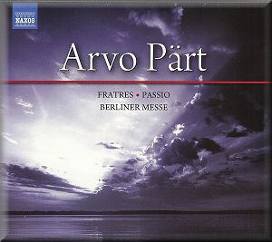Now you may take umbrage at my attitude toward this music; you may even like listening to it, which, I confess, I did for a number of years, before it all resembled itself, like a showroom full of Ikea furniture. But I’ve grown out of this now. If you listen to two albums by Pärt - one instrumental and one vocal - you’ve heard the extent of his compositional range. If you do like his music, I’d recommend checking out the ECM discs; I believe that the composer was involved with their recordings, and their performances, tempi and sound are generally better - though the recording of this Passio is quite spacious, and well-suited to the music. I’m especially partial to the texture that the Hilliard Ensemble provides in its recordings, and they feature on several of the ECM discs The first few discs on ECM - Tabula Rasa, Arbos, and the Passio - give you a fine introduction to Pärt’s music, and, unless you’re obsessive, you’ll probably want to stop there. Though having an endless number of Fratres versions seems to be designed for obsessives too. But these Naxos discs do come at the Naxos price, and this three-disc set is a good bargain.
