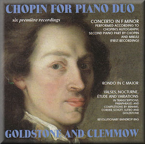 Anthony Goldstone and Caroline Clemmow are a well-known British piano duo formed in 1984. One of their specialities is to unearth little-known works that merit popularity; practically all their CDs include world premiere recordings. The present disc is dedicated to the two-piano music of Fryderyk Chopin. The composer himself did not leave much for the medium, and so the pianists have added Chopin-based works by other composers including Anthony Goldstone himself. The centerpiece is the two-piano transcription of the