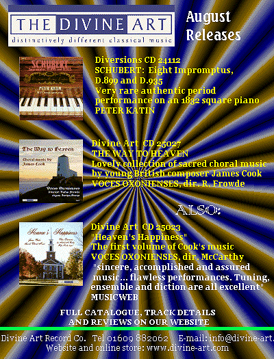 Every day up to 9000 MusicWeb review pages are read as verified by Google AdSense. Every one of those pages could be linked to your advertisement by a highlighted link or by a rotating banner. There will be at least 35,000 opportunities every week for our visitors to read your advertisement. RATE