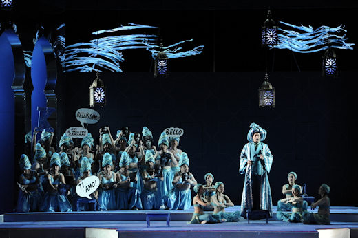 Emilio Sagi’s production at the ABAO was premiered in Santiago de Chile in October 2009 and had been shown in Lausanne last November. The sets are simple and attractive, although an awful lot of people are necessary to change the sets which can be quite bothersome in certain moments. Costumes are very appealing, with Isabella as a 1950s movie star at the centre. Colours are the core of this production, changing from white at the beginning to the colours of the Italian in the end, passing through red and blue in Mustafa’s palace. Good lighting can be expected in Sagi’s works, although I’ve seen better in other Sagi productions.