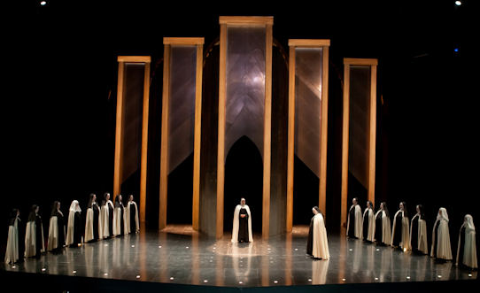 Toulouse’s Halle aux Grains is not exactly an opera venue, but a concert hall which provides a practical alternative when the Capitole is closed for building work. This has happened three times in recent years; the first time was in the 1995-96 season, then in the 2004-05 season and finally again now. The hall is a hexagon with a stage space in the centre and, of course, has very little stage equipment. This means that the productions offered in this space must be necessarily designed on the basis of the constraints of the hall and even the season’s program is largely conditioned by existing productions. This is probably the reason why Poulenc’s Dialogues des Carmelites was here again; it was last performed in Toulouse in 1995, when the opera season had moved away from the Capitole theatre.